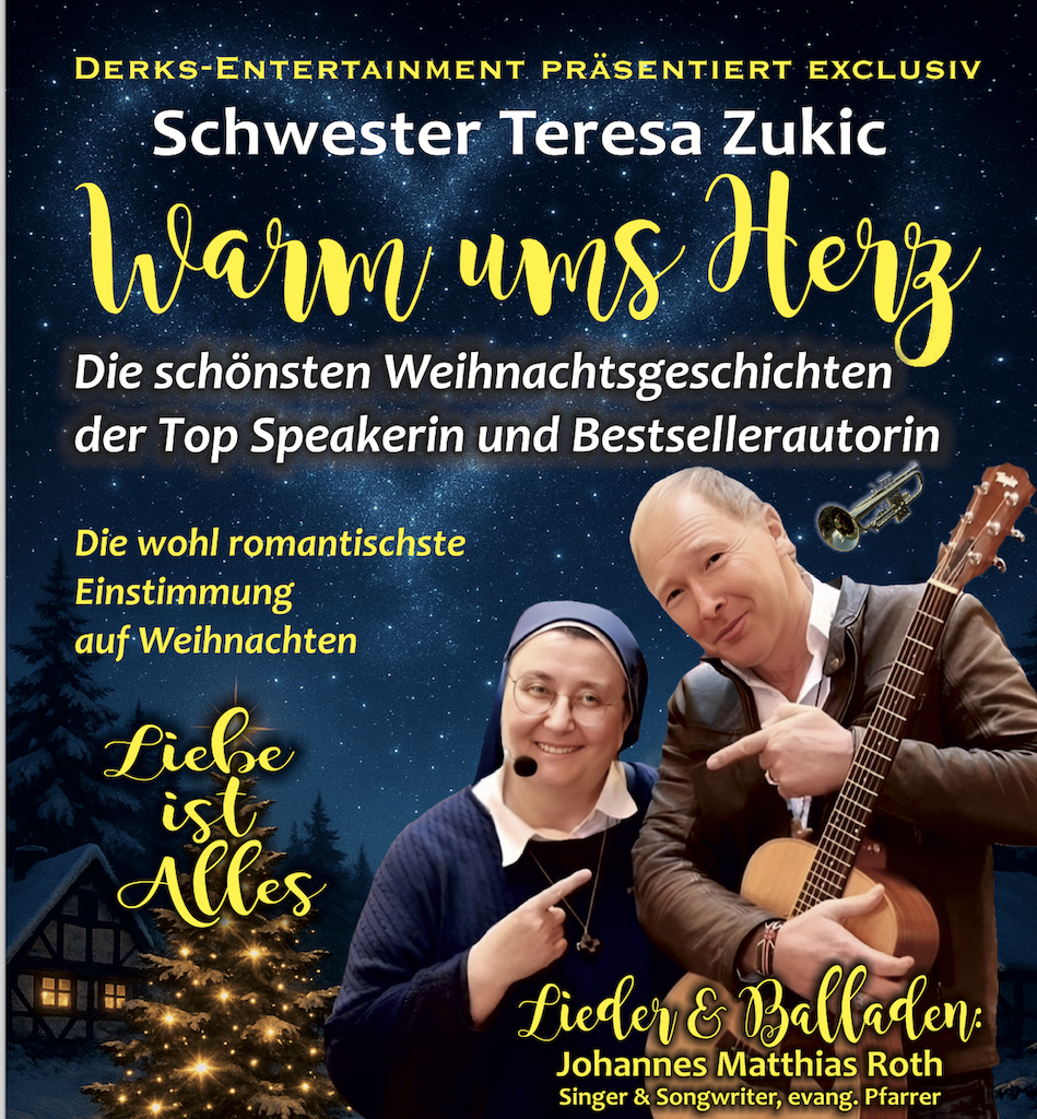 In 12 Städten verwandelt sich der Saal in einem Ort voller Wärme, Inspirationen und Träume: Schwester Teresa Zukic liest aus ihren berührendsten Weihnachtsgeschichten, teilt persönliche Einblicke und lässt das Publikum teilhaben an Momenten voller Hoffnung, Mut und Menschlichkeit.